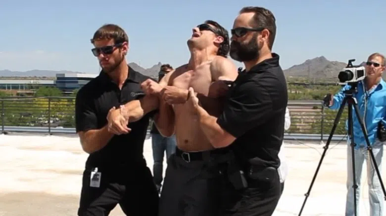 “The Slow Mo Guys” give us an up close look at a Taser impacting human skin in super slow motion.